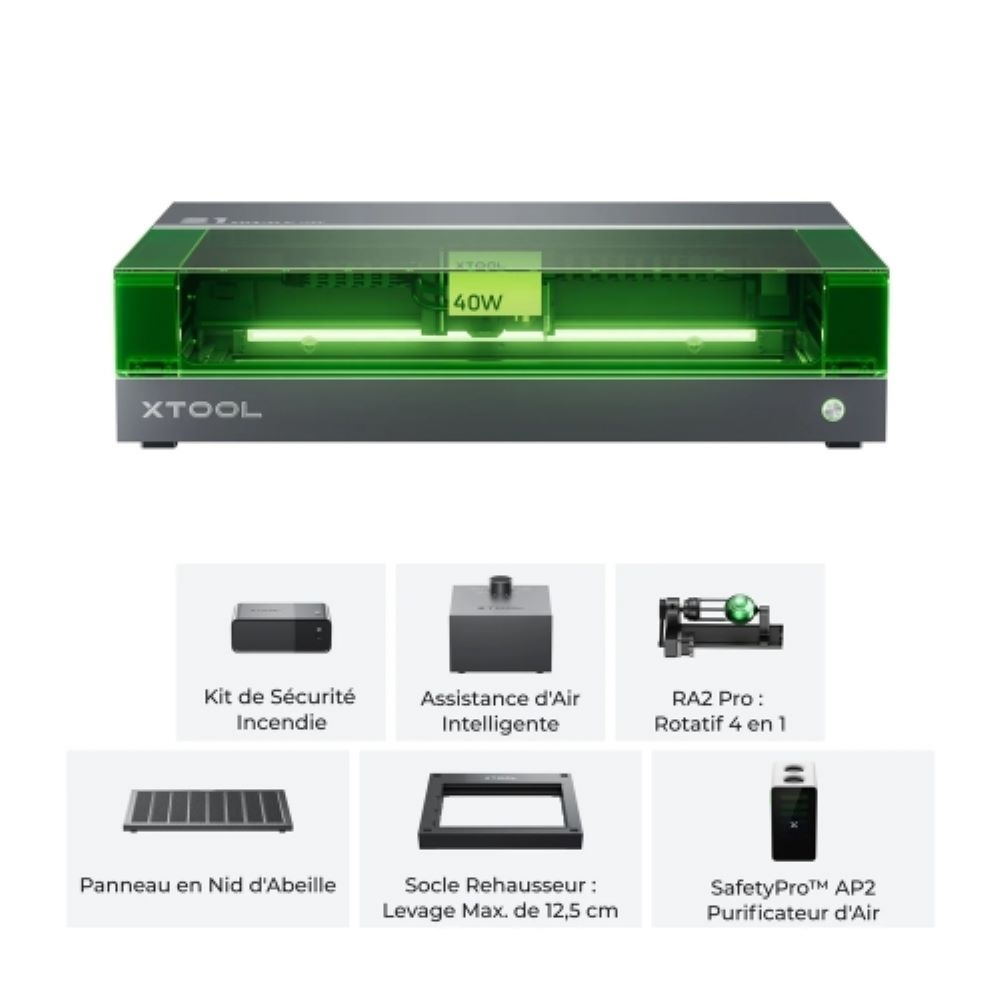 Le xTool S1 40 W – Kit de Luxe est un kit complet qui contient le xTool S1 40 W, une assistante d’air intelligente, un panneau en nid d’abeille, un kit de sécurité 1.5, un module rotatif RA2 Pro, une base élévatrice et un purificateur d’air de bureau.